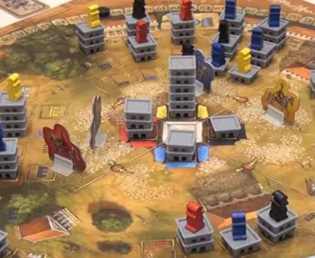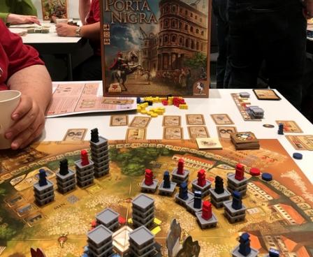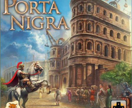 The game Porta Nigra (which translates as "black gate") is set in that place and time with the players taking on the roles of Roman architects working on the city gate of Porta Nigra. Each player commands a master builder, who moves around a circular track on the game board, enabling you to buy or build only where this master builder is located. Moving the master builder to farther locations along the track is expensive, so players must plan their movements and builds carefully. The number and type of actions that may be performed on your turn comes from cards in your personal draw deck.