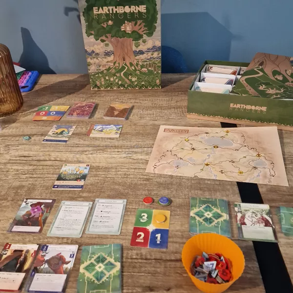Earthborne Rangers is a customizable, co-operative card game set in the wilderness of the far future. You take on the role of a Ranger, a protector of the mountain valley you call home: a vast wilderness transformed by monumental feats of science and technology devised to save the Earth from destruction long ago. The story of Earthborne Rangers is presented as a branching narrative campaign consisting of a main storyline and a multitude of side stories. In it, you can choose to follow the critical path or to strike off on your own to discover the Valley's many engaging characters, mysterious ruins, and beings both familiar and strange.