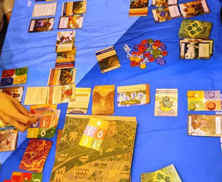 An individual game session is played in rounds, and those rounds consist of turns. On your turn, you perform one action: either play a card from your hand, or choose an action from a card on the table. Each action allows you to interact thematically and narratively with the world, and each time you take an action, the world comes to life around you. Predators stalk their prey, rain pours from the sky, rocks tumble down the mountain to block your path, and much more.
