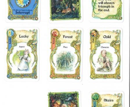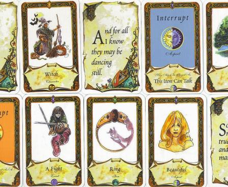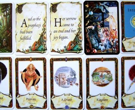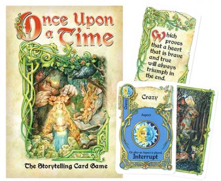 Once Upon A Time is a game in which the players create a story together, using cards that show typical elements from fairy tales. One player is the Storyteller and creates a story using the ingredients on her cards. She tries to guide the plot towards her own ending. The other players try to use cards to interrupt her and become the new Storyteller. The winner is the first player to play out all her cards and end with her Happy Ever After card.