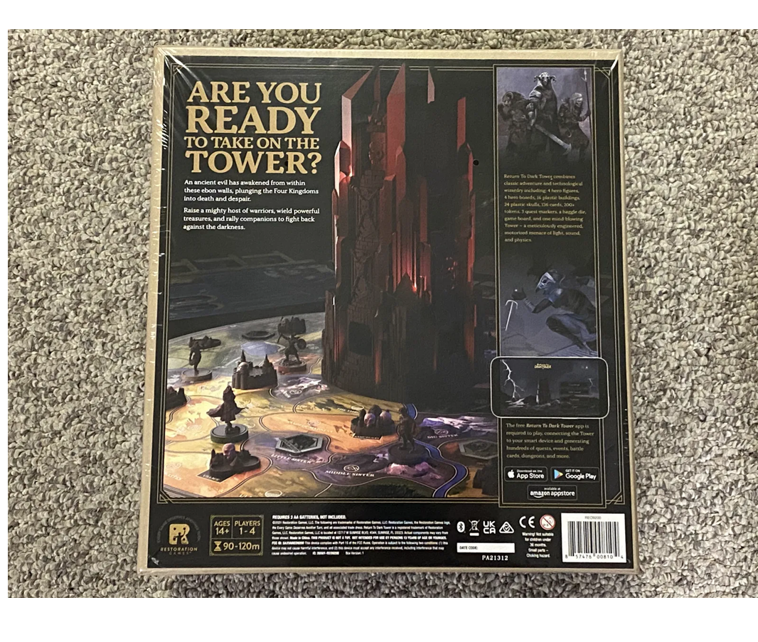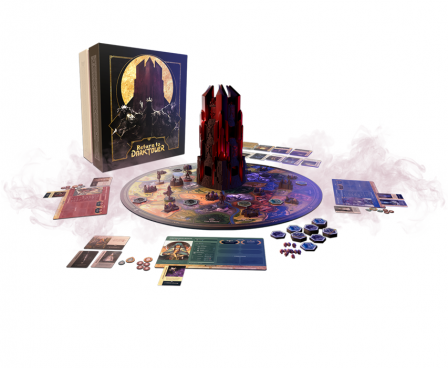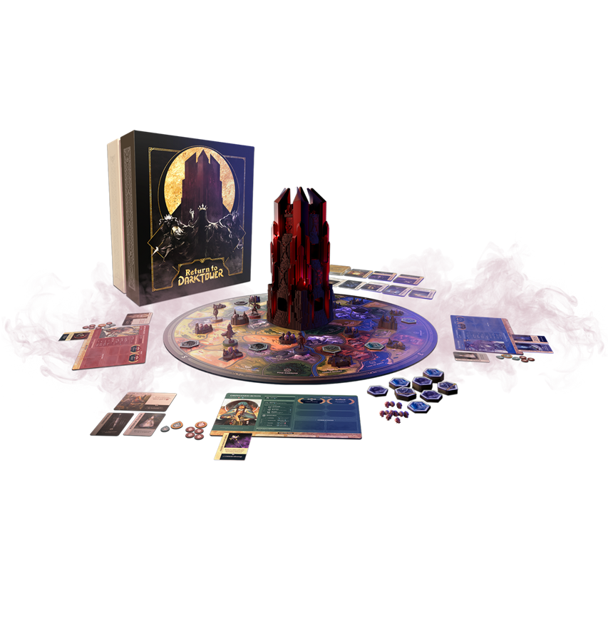 A "sequel" to the 1981 grail game, Return to Dark Tower is a game for 1-4 players who take the role of heroes. Together, they gather resources, cleanse buildings, defeat monsters, and undertake quests to build up their strength and discern what foe ultimately awaits them. When the heroes face the tower, the game shifts into its dramatic second act, where the players have one chance to defeat the enemy once and for all.