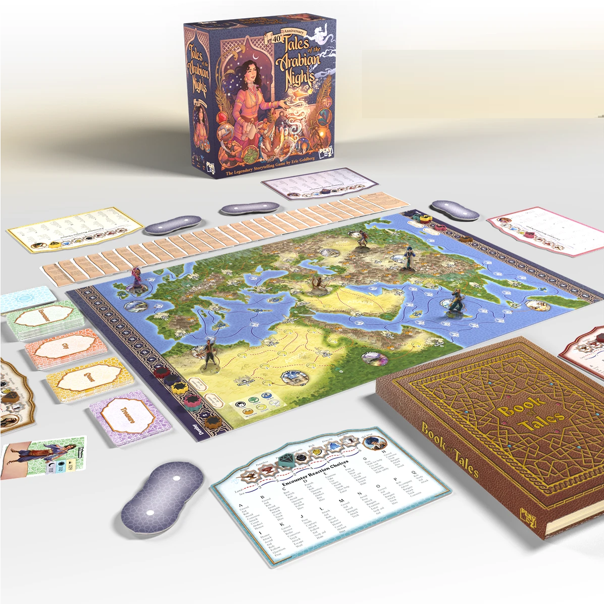 The newest version of the Tales of the Arabian Nights celebrating its 40th anniversary. Enter the lands of the Arabian Nights alongside Sindbad, Scheherazade, Aladdin, and the other legendary heroes of the 1001 Tales. Travel the world encountering imprisoned princesses, powerful `efreets, evil viziers, and such marvels and the enigmatic Magnetic Mountain, the terrifying Ape Island, and the lustrous Crystal Palace.