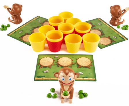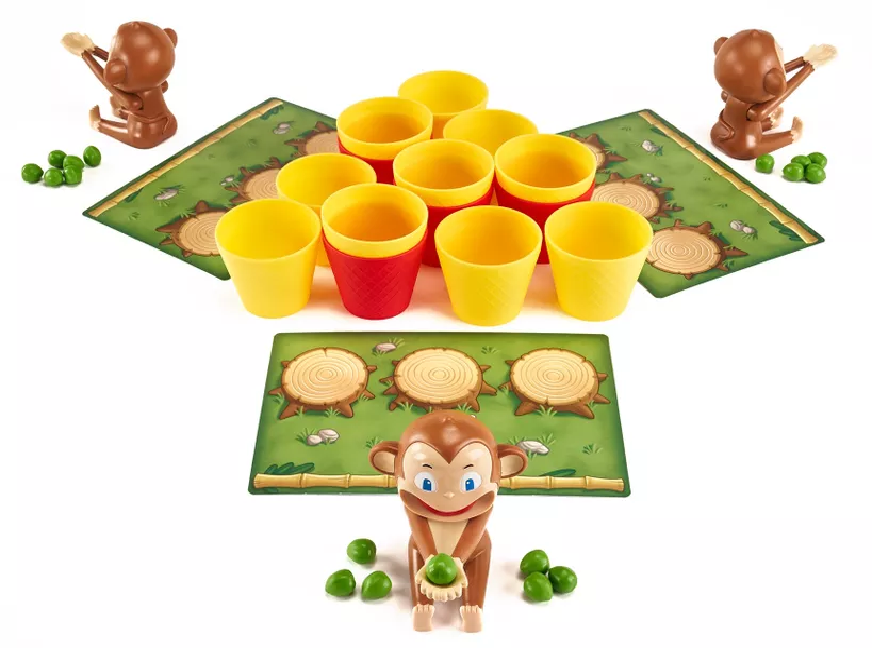 In the game, players launch coconuts toward a field of cups in the middle of the playing area. Land in a cup, and you get to stack it on your player board; land in a cup on someone else's board, and you get to move it to yours. By playing special "Monkey King Magic" cards, you can force opponents to shoot blind, take long shots, or otherwise bollix their efforts to cup a coconut. Whoever first completes a pyramid of six cups on his player board wins!