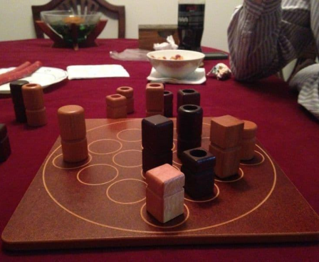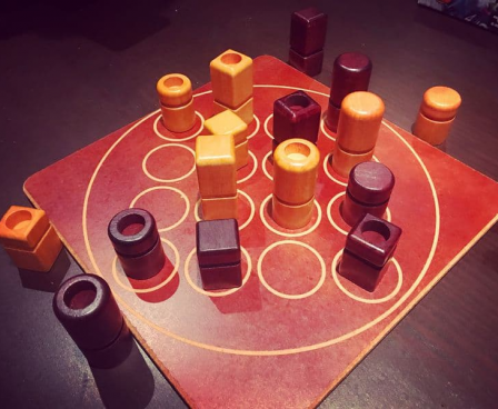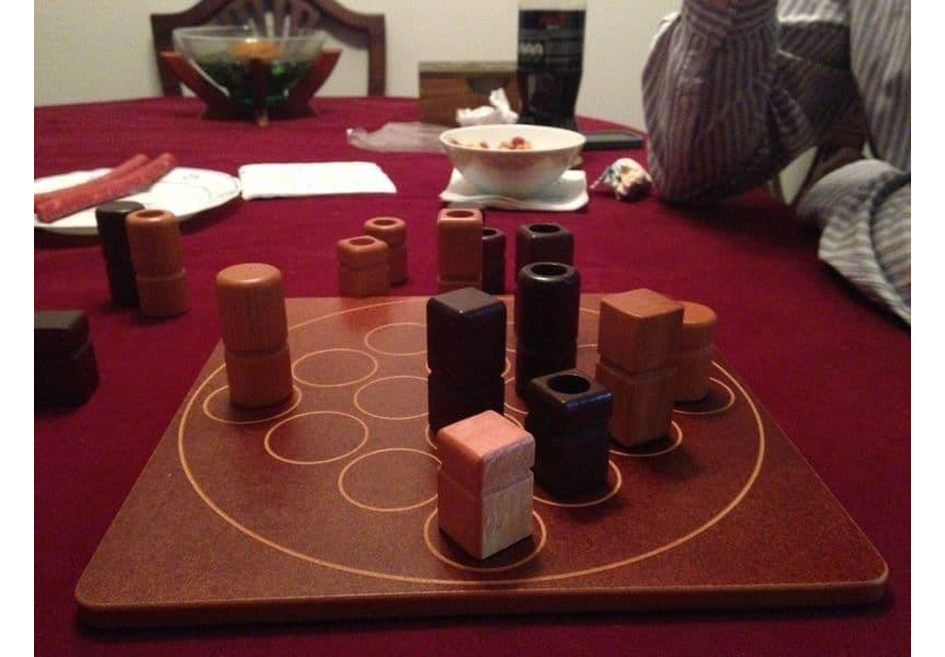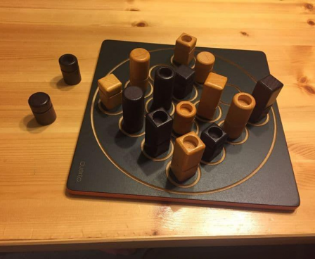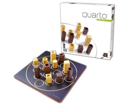 Quarto! has a 4×4 board and 16 pieces. Each piece has four dichotomous attributes – color, height, shape, and consistency – so each piece is either black or white, tall or short, square or round, and hollow or solid. The object is to place the fourth piece in a row in which all four pieces have at least one attribute in common. The twist is that your opponent gets to choose the piece you place on the board each turn.