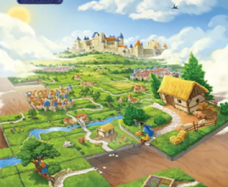 Carcassonne is a tile-placement game in which the players draw and place a tile with a piece of southern French landscape on it. The tile might feature a city, a road, a cloister, grassland or some combination thereof, and it must be placed adjacent to tiles that have already been played, in such a way that cities are connected to cities, roads to roads, etcetera. Having placed a tile, the player can then decide to place one of his meeples on one of the areas on it: on the city as a knight, on the road as a robber, on a cloister as a monk, or on the grass as a farmer. When that area is complete, that meeple scores points for its owner.