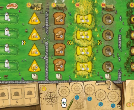 1. Players take turns and do one of eight possible actions, from building, to upgrading, trading and exporting. When players run out of money, they pass and collect a passing bonus.