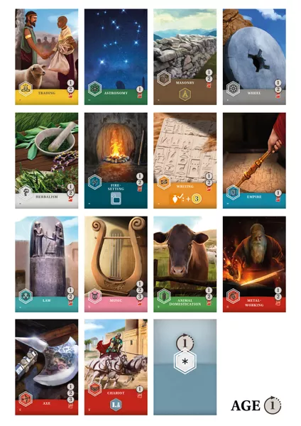 The game’s setting spans several millennia, a time span of thousands of years. Players go through eight ages, from the ancient to medieval ages, to the modern age, and finally to the near future, until the player with most fame wins. The game features more than 300 unique cards with more than 200 distinct illustrations showcasing historical inventions, buildings, and wonders. Your goal is to acquire the most advantageous cards to advance different aspects of your civilization, like research, military, population, prosperity, and culture.