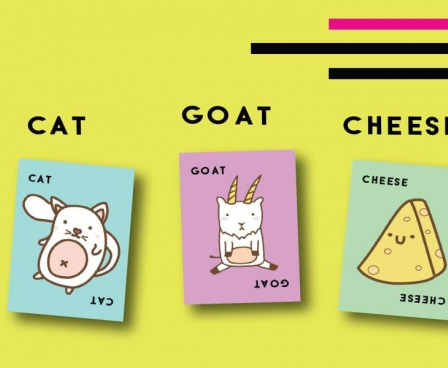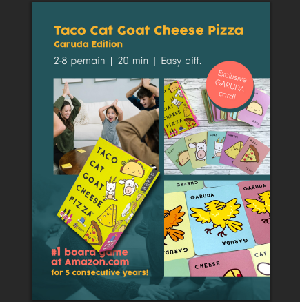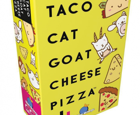 Taco Cat Goat Cheese Pizza is filled to the brim with hand-slapping mayhem! As in Snap and Dobble, each player places a card from their hand face up into a community pile while saying taco/cat/goat/cheese/pizza in player sequence. When the card matches the mantra — boom! — everyone slaps their hand on the deck, with the last one to slap picking up the cards. Whoever rids themselves of cards first wins!