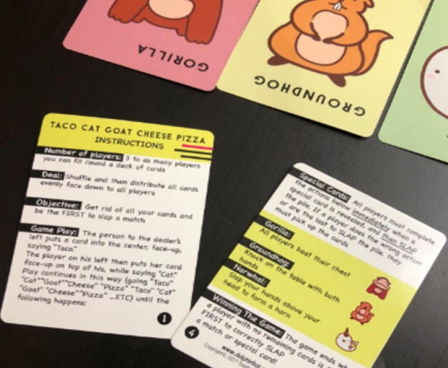 For extra fun, special action cards – the gorilla, narwhal, and groundhog — force players to make certain gestures before racing to slap the deck!