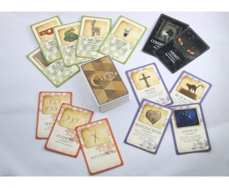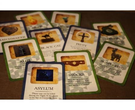 Players, each acting as one of these unique characters, are given 3-5 Tryal cards (depending on the number of players). These Tryal cards reveal the true identity of each player, "Witch" or "Not a Witch."